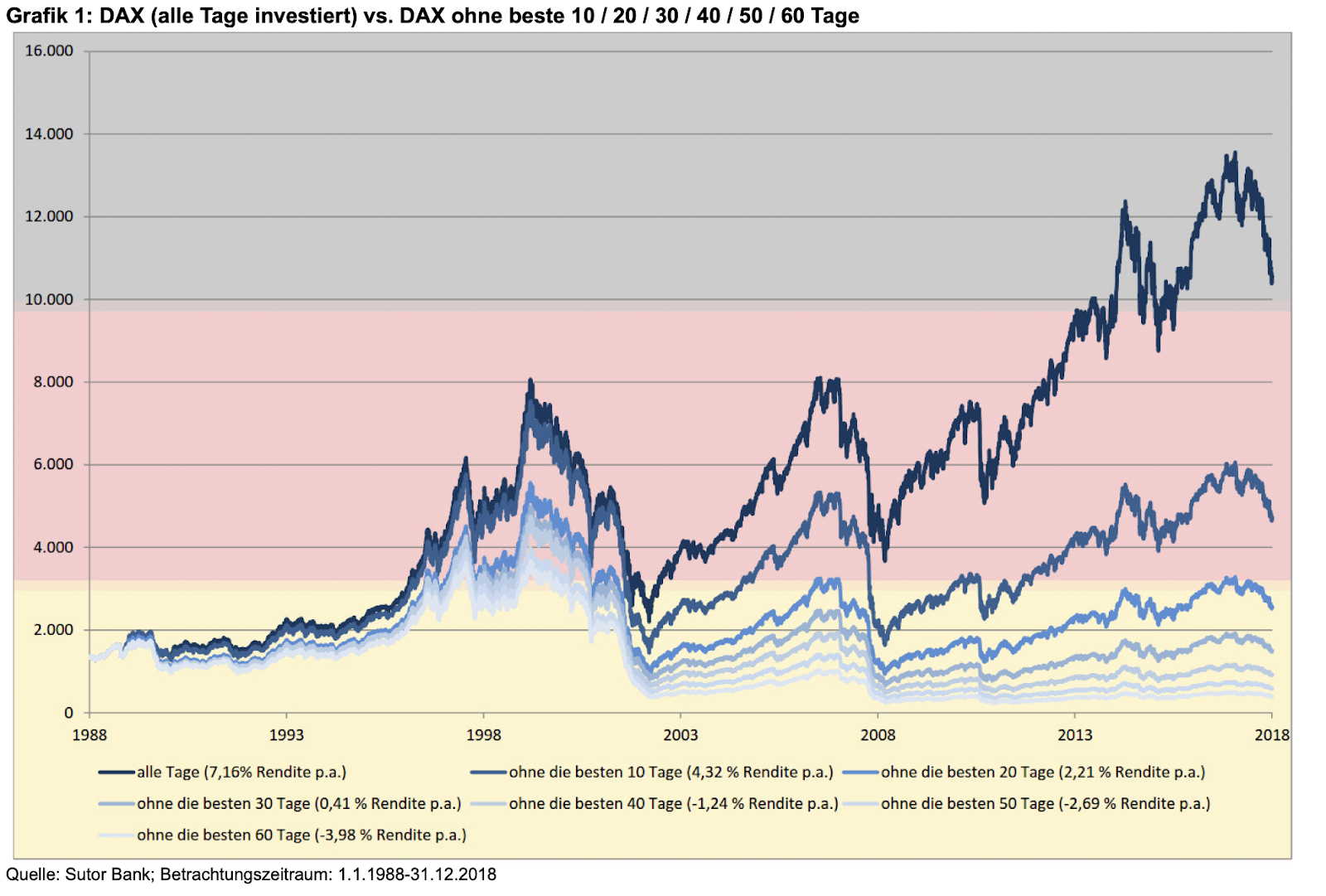 Die Analyse der Sutor Bank ergab: Bei einem Anleger, der im DAX zwischen 1988 und 2018 die besten 13 Tage versäumt hat, schrumpft die Rendite auf die Hälfte. Verpasst er die besten 33 Tage, hätte er sogar Geld verloren.