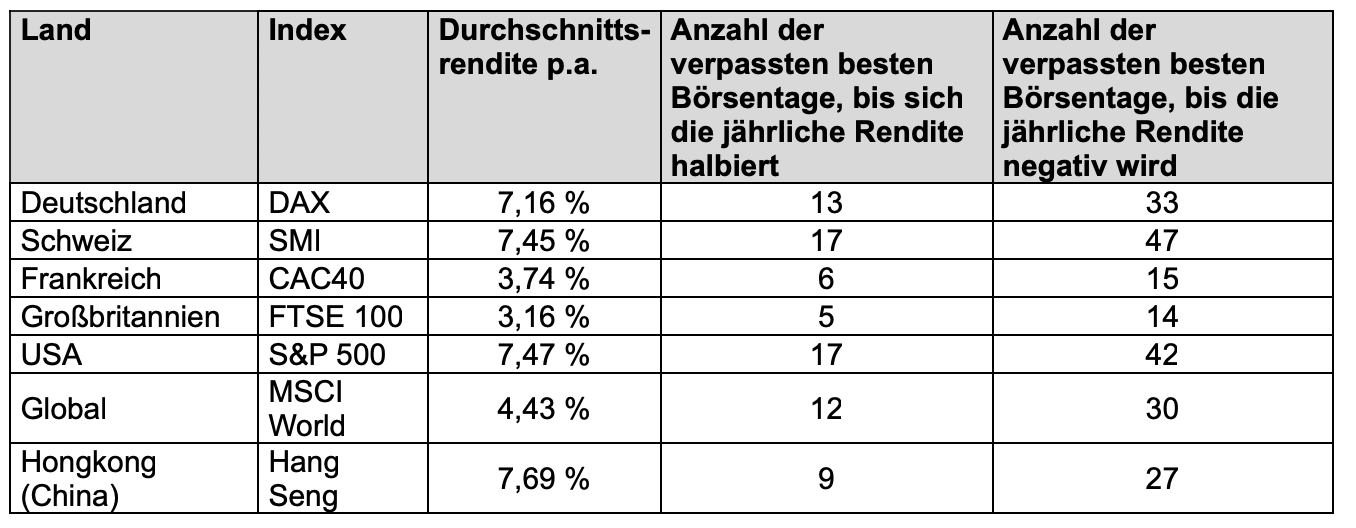 Tabelle: Anzahl verpasste beste Börsentage und Auswirkungen auf die Rendite – nach Länderindizes (Zeitraum: 31 Jahre; 1988-2018; in Euro).