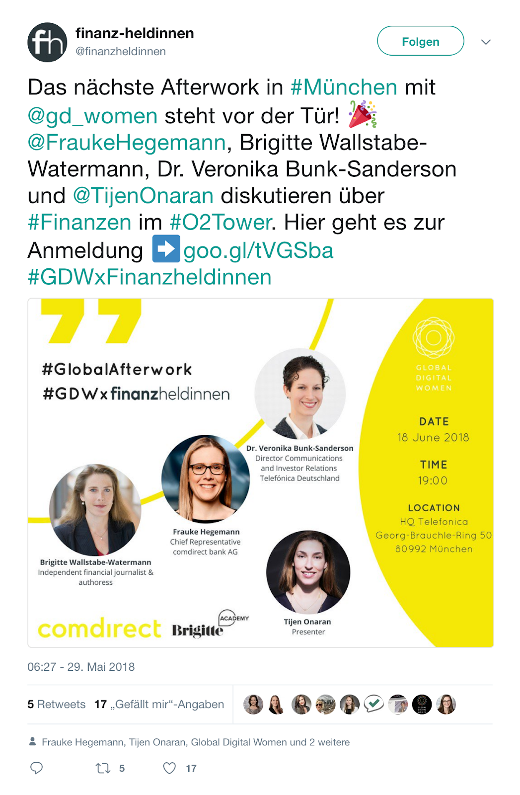 Helfen dabei können Vernetzungsinitiativen wie #global digital women, die mit den #Finanzheldinnen zusammenarbeitet – eine Initiative gestartet von Mitarbeiterinnen der comdirect Bank. Okay, könnte man meinen, da steckt eine Bank dahinter, die etwas verkaufen möchte. Aber wer die Frauen kennt, die sich dafür einsetzen, muss konstatieren, dass es durchaus um mehr geht – nämlich Frauen wirklich dafür zu begeistern, ihre Finanzen klug zu verwalten und zu vermehren. Mir hat es jedenfalls Spaß gemacht, beim gemeinsamen Afterwork gdw und finanzheldinnen am 18. Juni auf dem Podium mit dabei zu sein und mit vielen Frauen danach ins Gespräch zu kommen.
