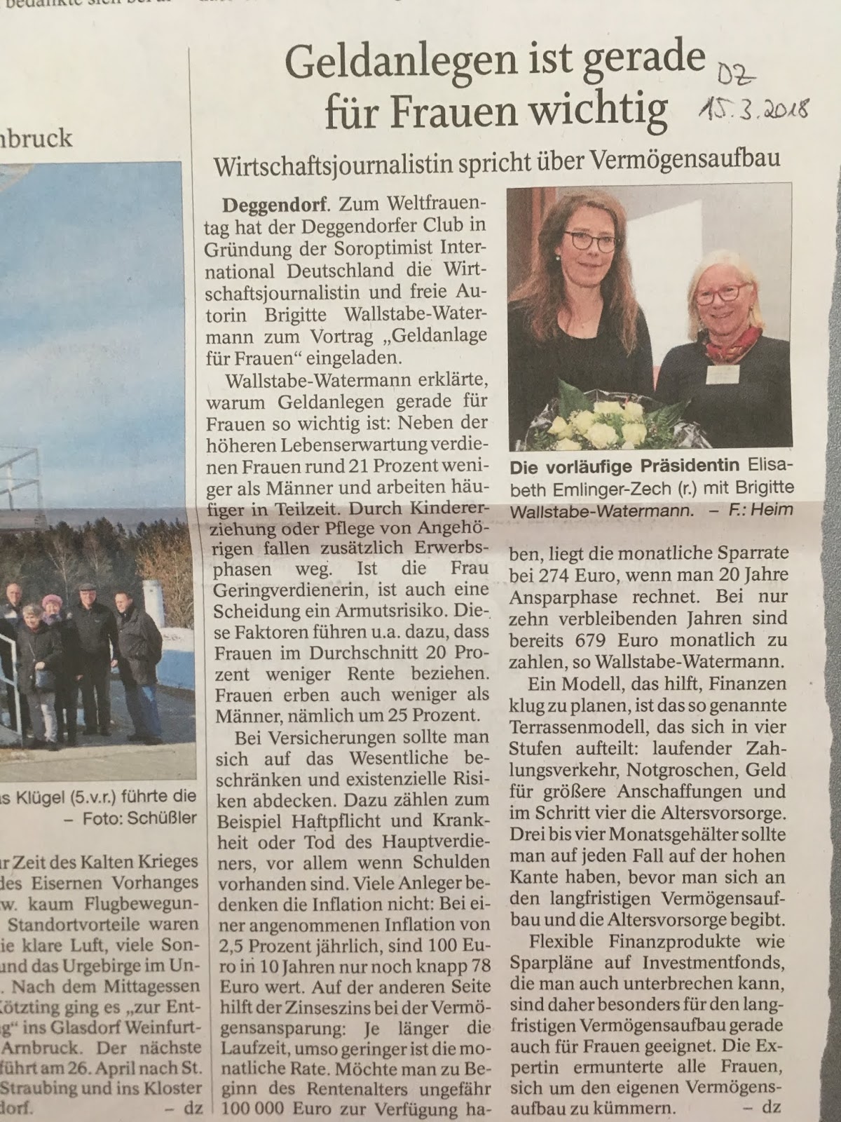 Und hier geht es zum Bericht aus der Deggendorfer Zeitung über meinen jüngsten Vortrag zum Thema Frauen & Geldanlage, den ich in zum Weltfrauentag gehalten habe.