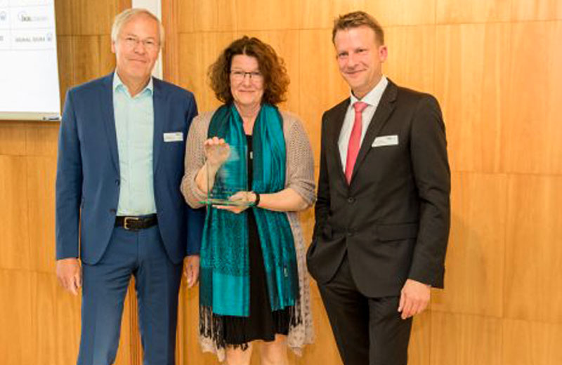 Verleihung des Medienpreis Mittelstand für den Beitrag „China kauft den Mittelstand – Schluss mit ‚made in Germany‘?“ für den Bayerischer Rundfunk. Die Preisträger 1. Platz TV max: Ralph Gladitz und Gisela Baur mit ihrem Juror Edzard Bennmann (v.l.n.r.)
