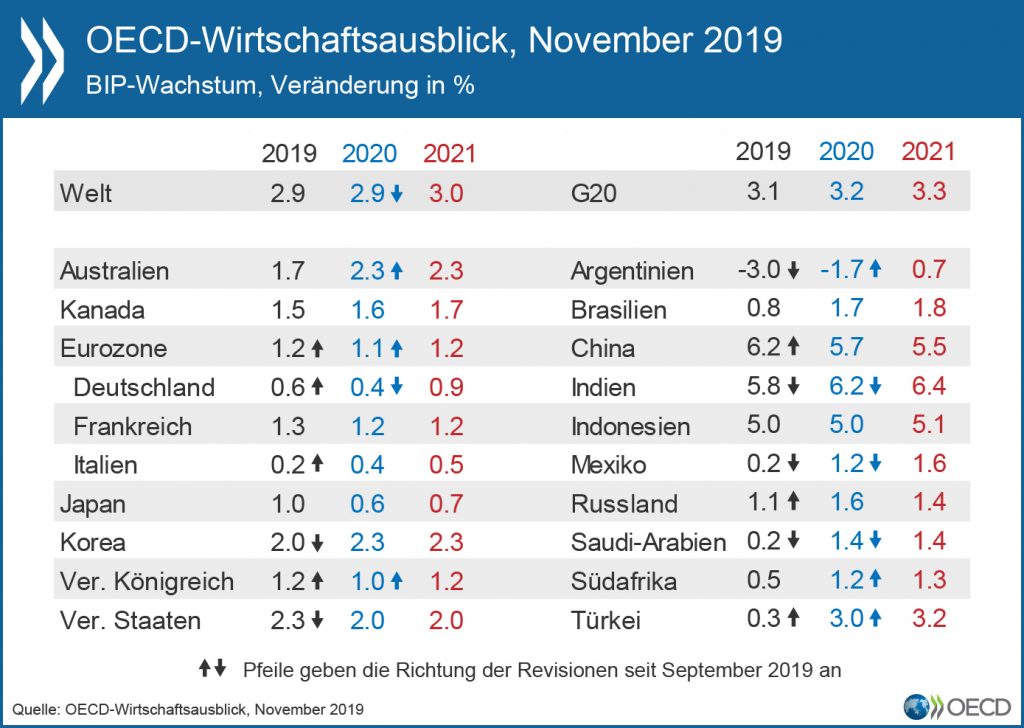 Mit China, Indien und den USA als „Konjunkturlokomotiven“ soll die Weltwirtschaft 2019 nur noch um 2,9 Prozent wachsen, so die Erwartung der OECD, die heute veröffentlicht wurden. Im Mai hatten die Experten noch mit 3,2 Prozent gerechnet. Die Wachstumsaussichten für viele Länder – auch für Deutschland – wurden zurückgestuft.