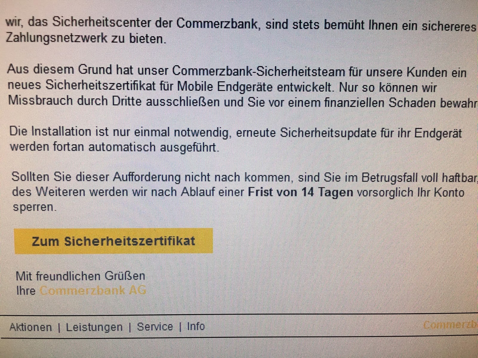 Die Mail sieht täuschend echt aus, mein Name wird genannt, Absender ist sicherheit@commerzbank.de. Da ich kein Kunde der #Commerzbank bin, ist klar, dass es sich um eine Phishing-Mail handelt und jemand nur an Kontodaten kommen will. Auch eine telefonische Rückfrage unter der 24-Stunden-Hotline der Bank bestätigt dies. Also: Sofort löschen!