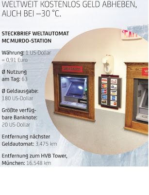 Was damals exotisch war und anfänglich nur für eine ausgewählte Kundschaft bestimmt, ist heute eine Selbstverständlichkeit. Sogar an den entlegensten Ecken der Welt sind Geldautomaten zu finden – selbst in der Antarktis, wie die HypoVereinsbank informiert.